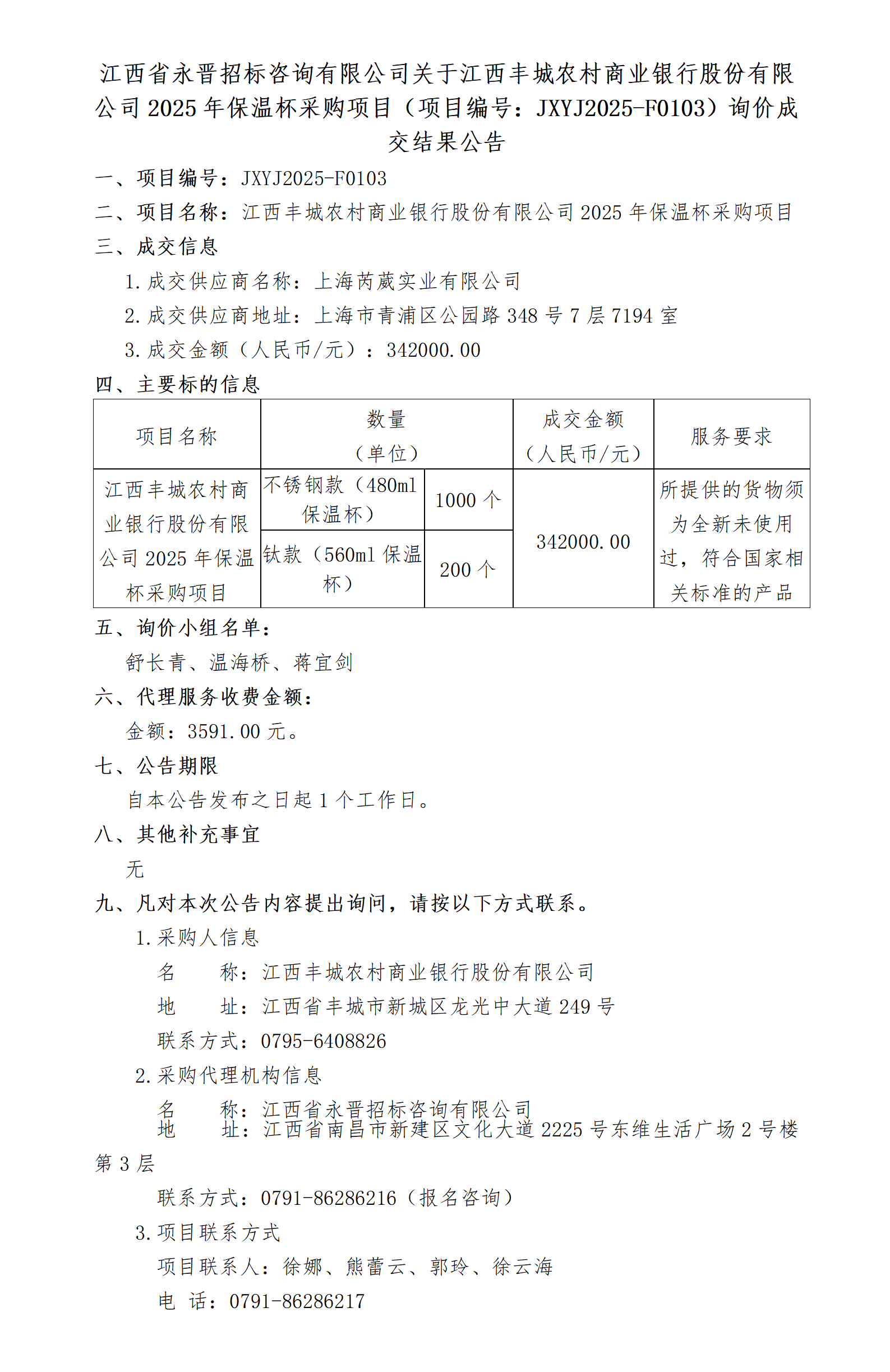 江西省永晋招标咨询有限公司关于江西丰城农村商业银行股份有限公司2025年保温杯采购项目(项目编号:JXYJ2025-F0103)询价成交结果公告