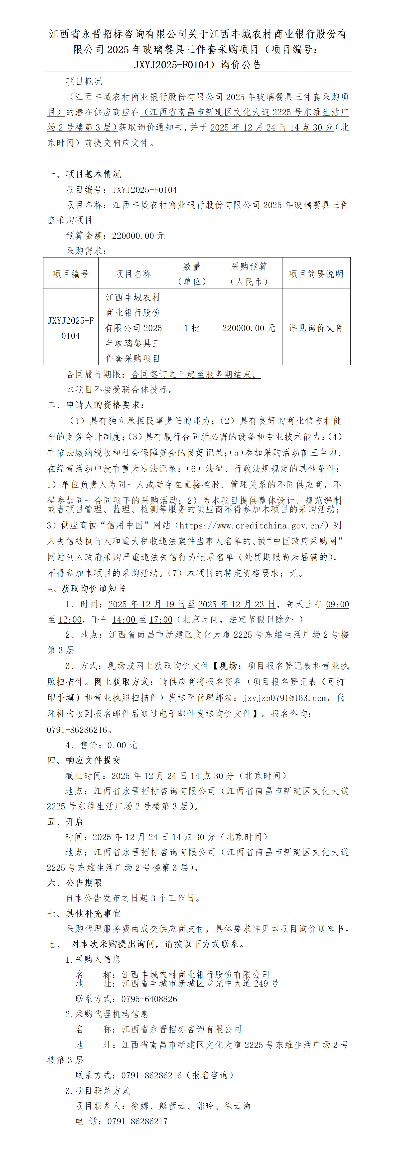 江西省永晋招标咨询有限公司关于江西丰城农村商业银行股份有限公司2025年玻璃餐具三件套采购项目(项目编号:JXYJ2025-F0104)询价公告