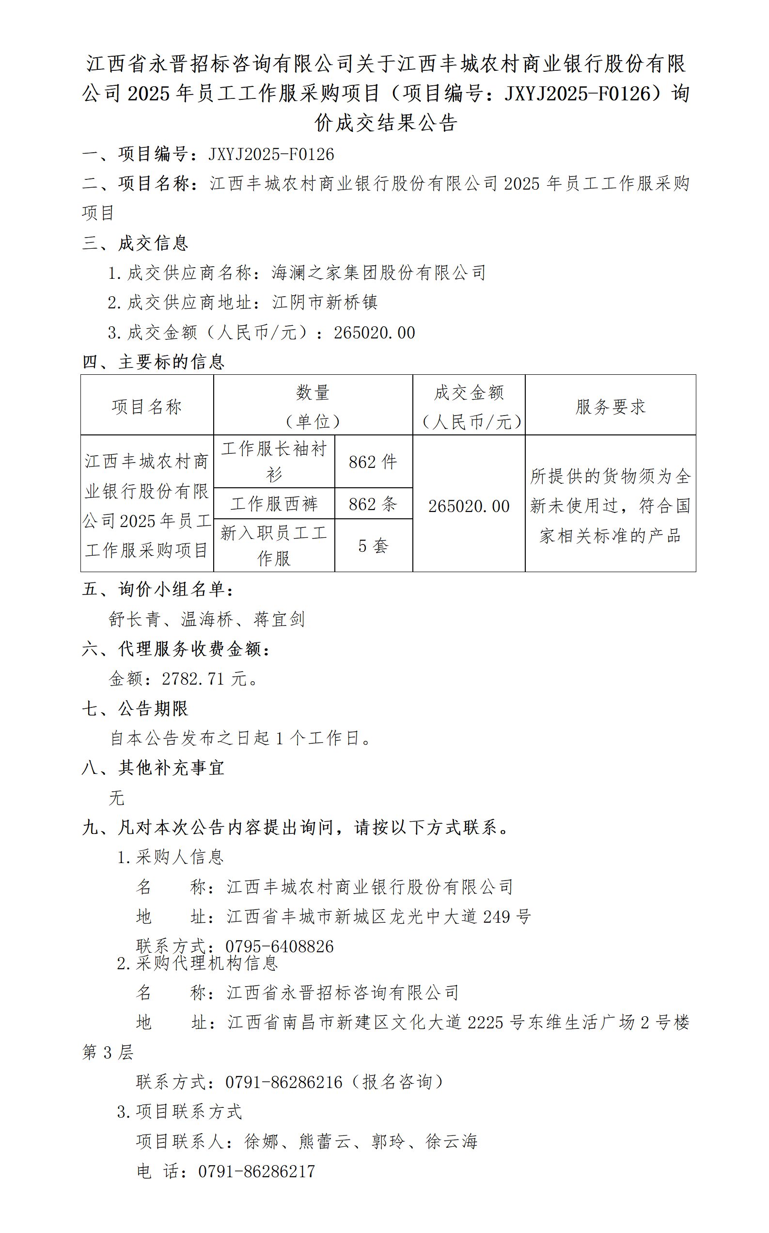 江西省永晋招标咨询有限公司关于江西丰城农村商业银行股份有限公司2025年员工工作服采购项目(项目编号:JXYJ2025-F0126)询价成交结果公告