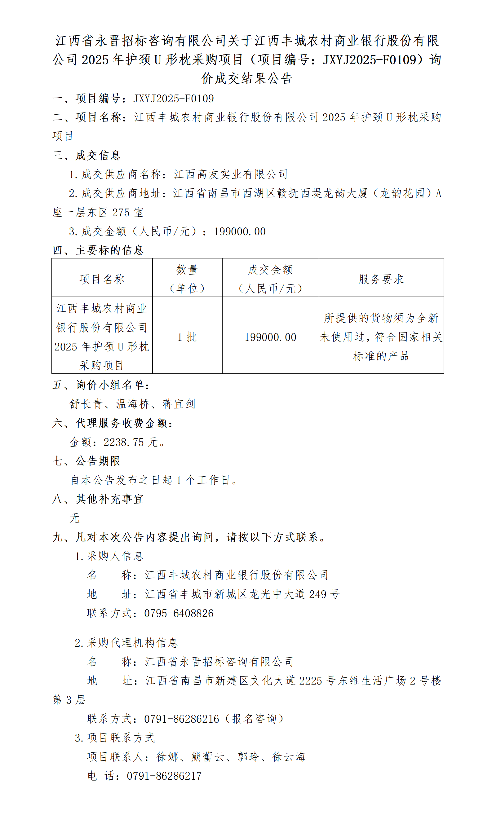 江西省永晋招标咨询有限公司关于江西丰城农村商业银行股份有限公司2025年护颈U形枕采购项目(项目编号:JXYJ2025-F0109)询价成交结果公告