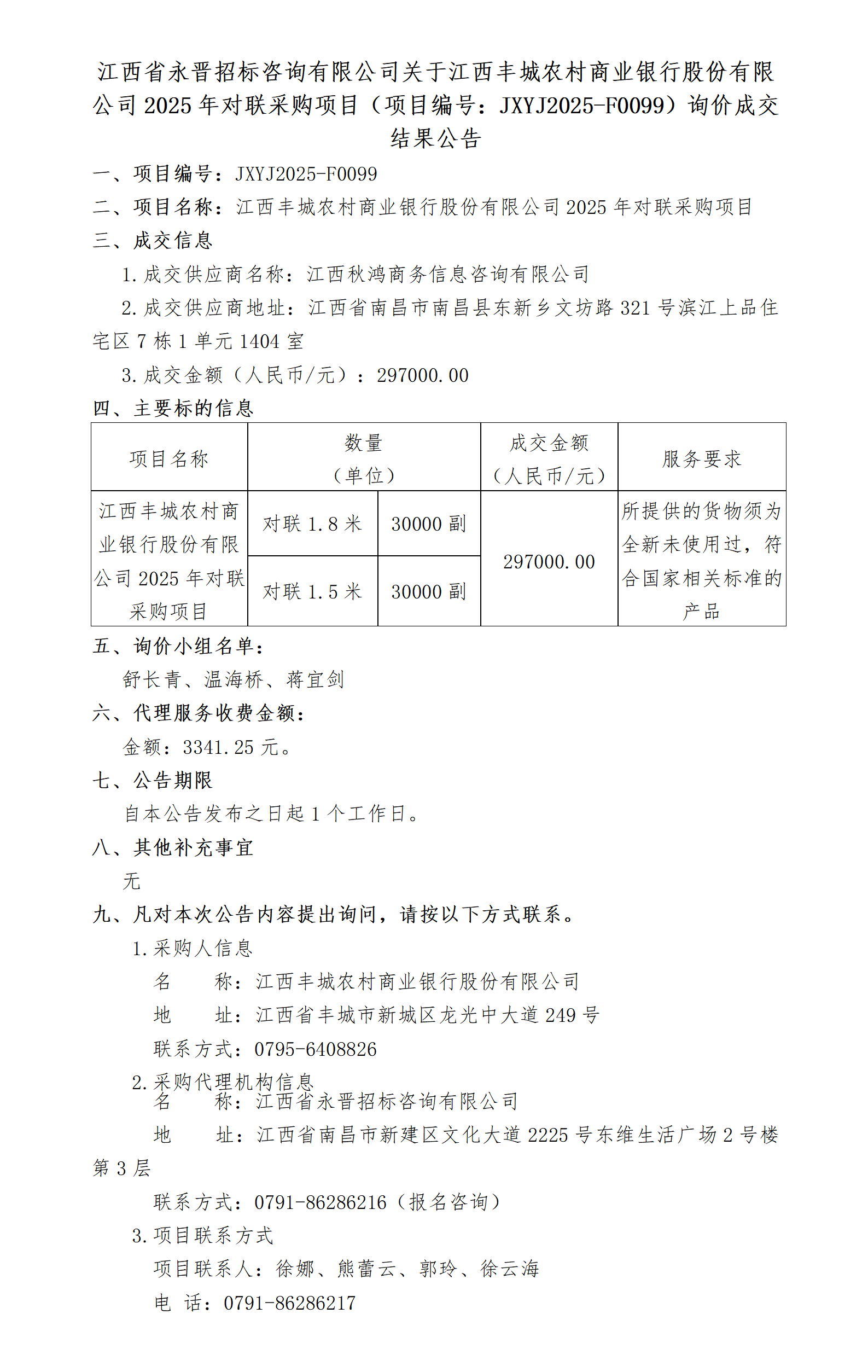 江西省永晋招标咨询有限公司关于江西丰城农村商业银行股份有限公司2025年对联采购项目(项目编号:JXYJ2025-F0099)询价成交结果公告