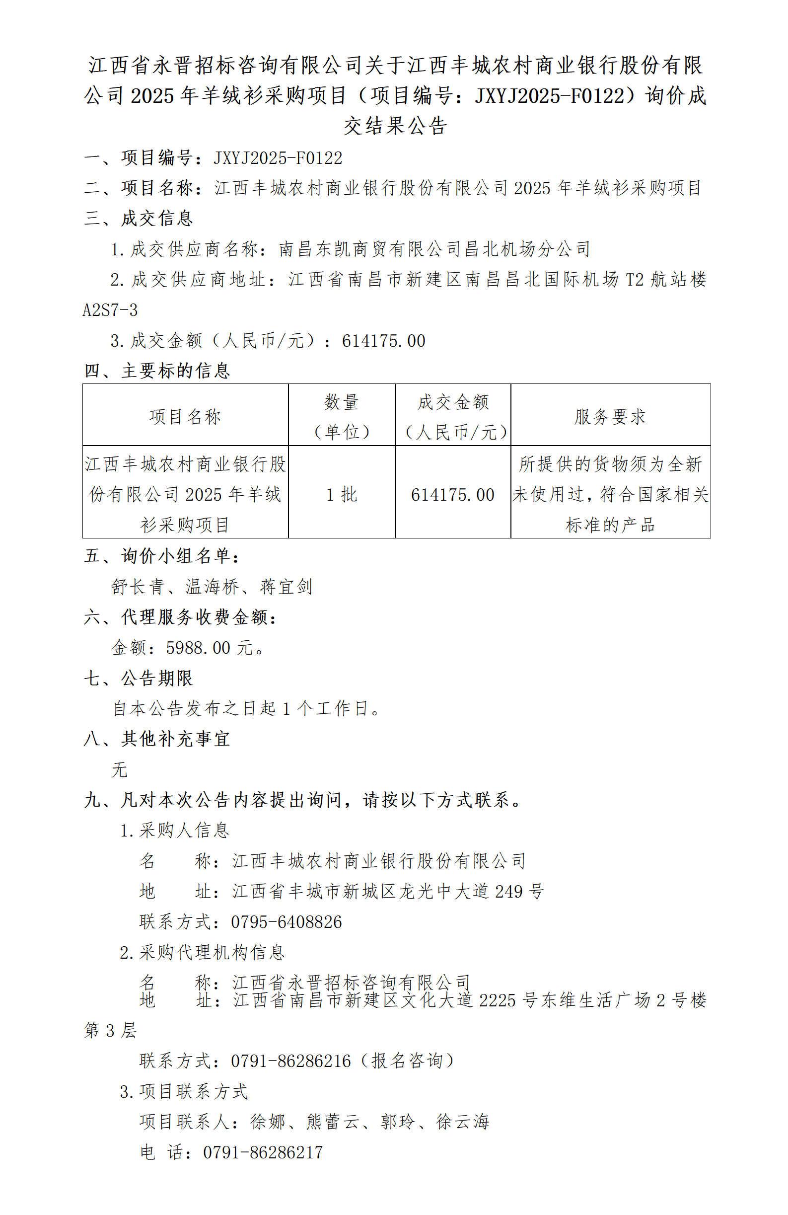 江西省永晋招标咨询有限公司关于江西丰城农村商业银行股份有限公司2025年羊绒衫采购项目(项目编号:JXYJ2025-F0122)询价成交结果公告