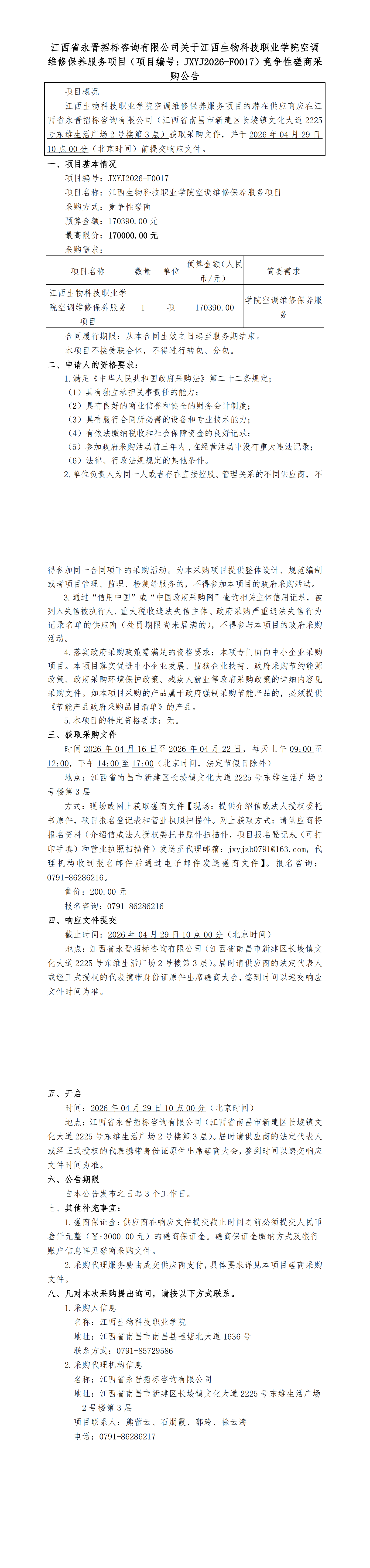 江西省永晋招标咨询有限公司关于江西生物科技职业学院空调维修保养服务项目(项目编号:JXYJ2026-F0017)竞争性磋商采购公告