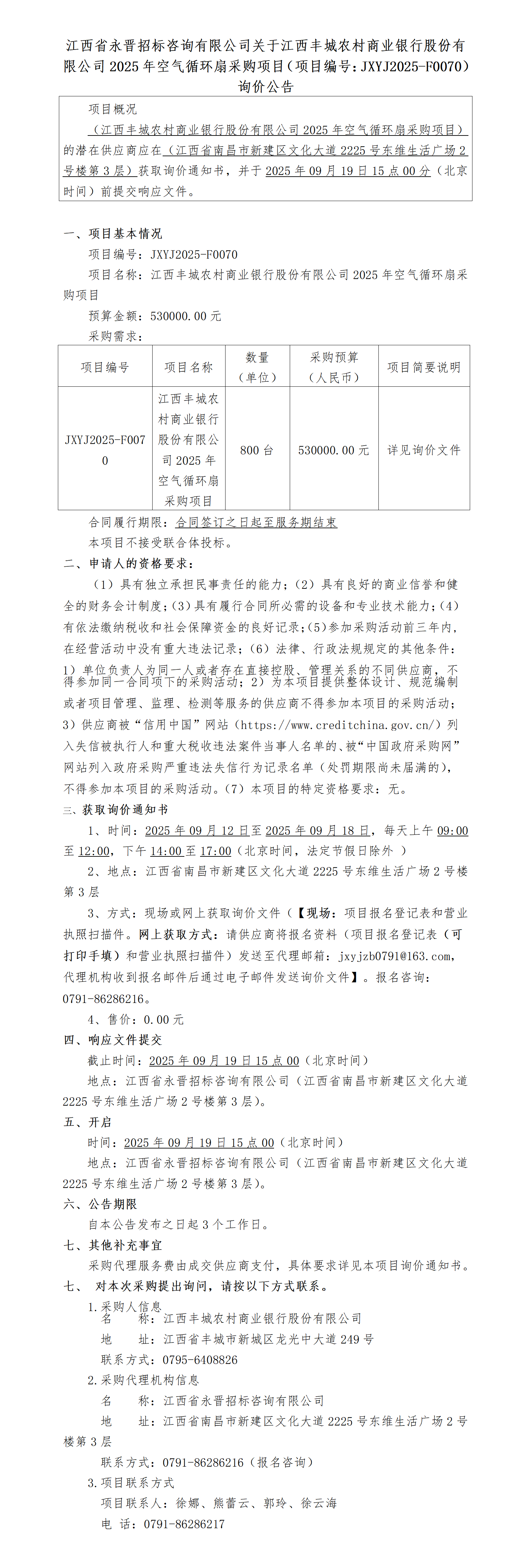 江西省永晋招标咨询有限公司关于江西丰城农村商业银行股份有限公司2025年空气循环扇采购项目(项目编号:JXYJ2025-F0070) 询价公告